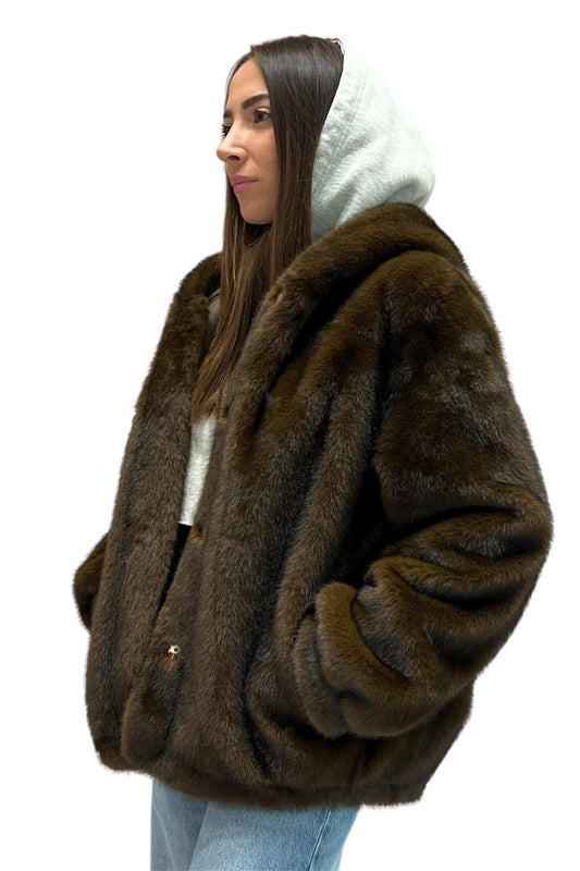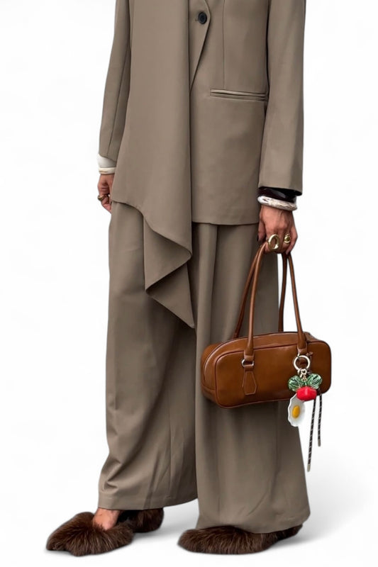 Tailleur grigio fango gessato con giacca oversize monopetto e pantalone palazzo
