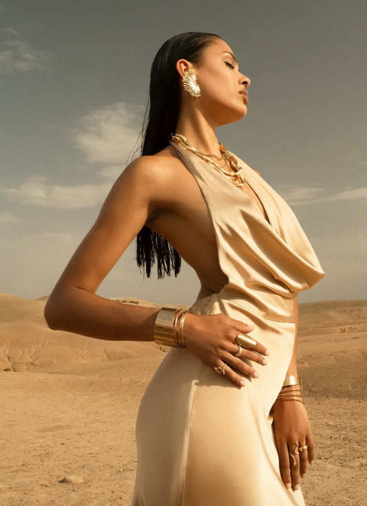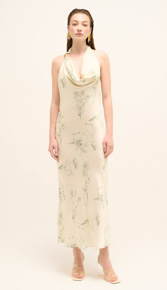 Abito bianco a fantasia effetto satin con schiena scoperta e dettaglio oro