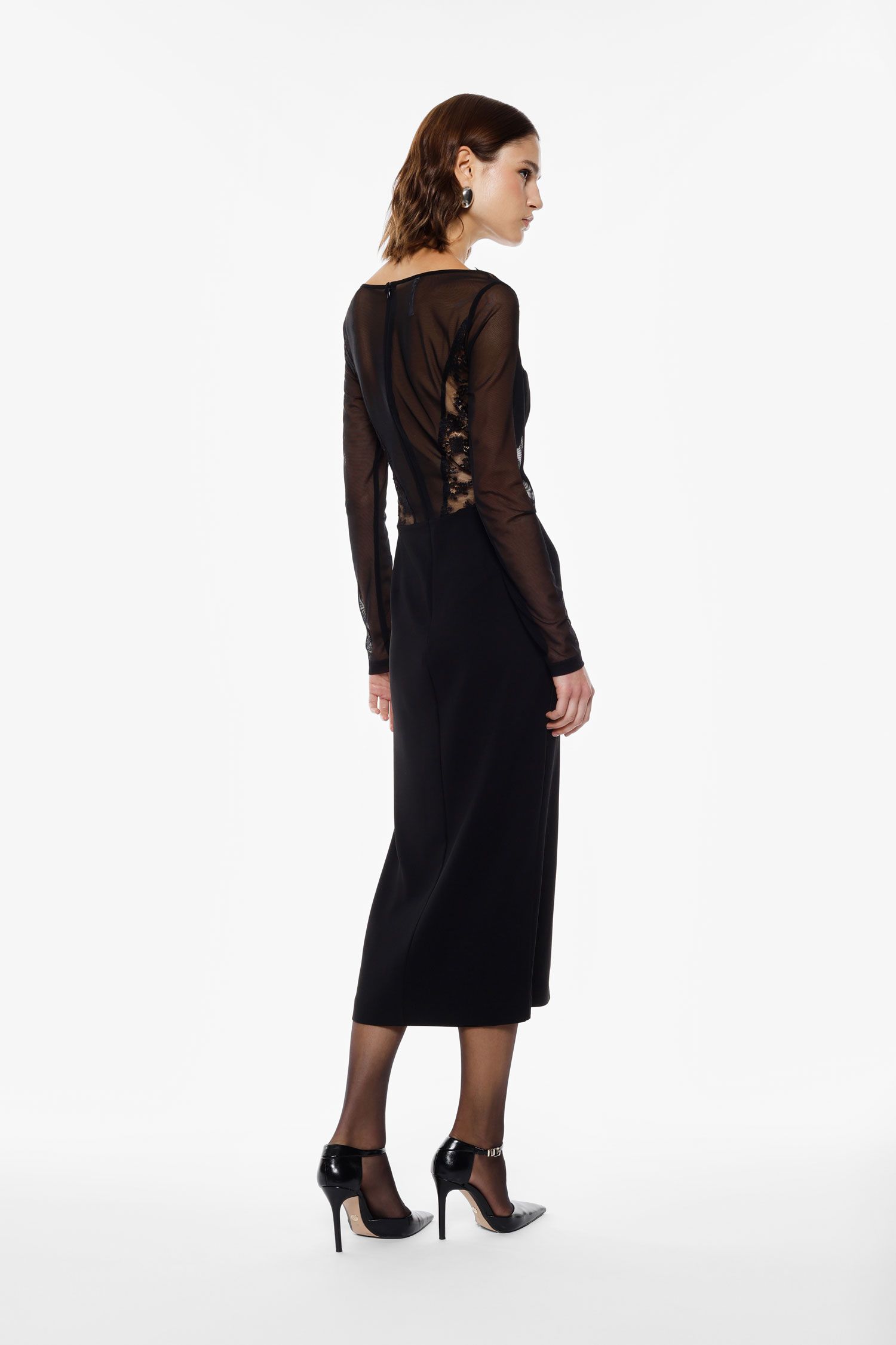 Abito midi dalla silhouette raffinata, impreziosito da maniche lunghe velate e dettagli in pizzo sul busto e in vita. La profonda scollatura a v dona carattere, mentre lo spacco anteriore aggiunge dinamismo. La chiusura a zip posteriore garantisce una vestibilità impeccabile e pratica.