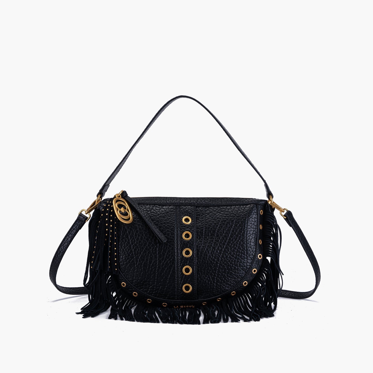 Borsa a spalla in ecopelle effetto martellato con occhielli in oro e frange, tracolla e manico rimovibile