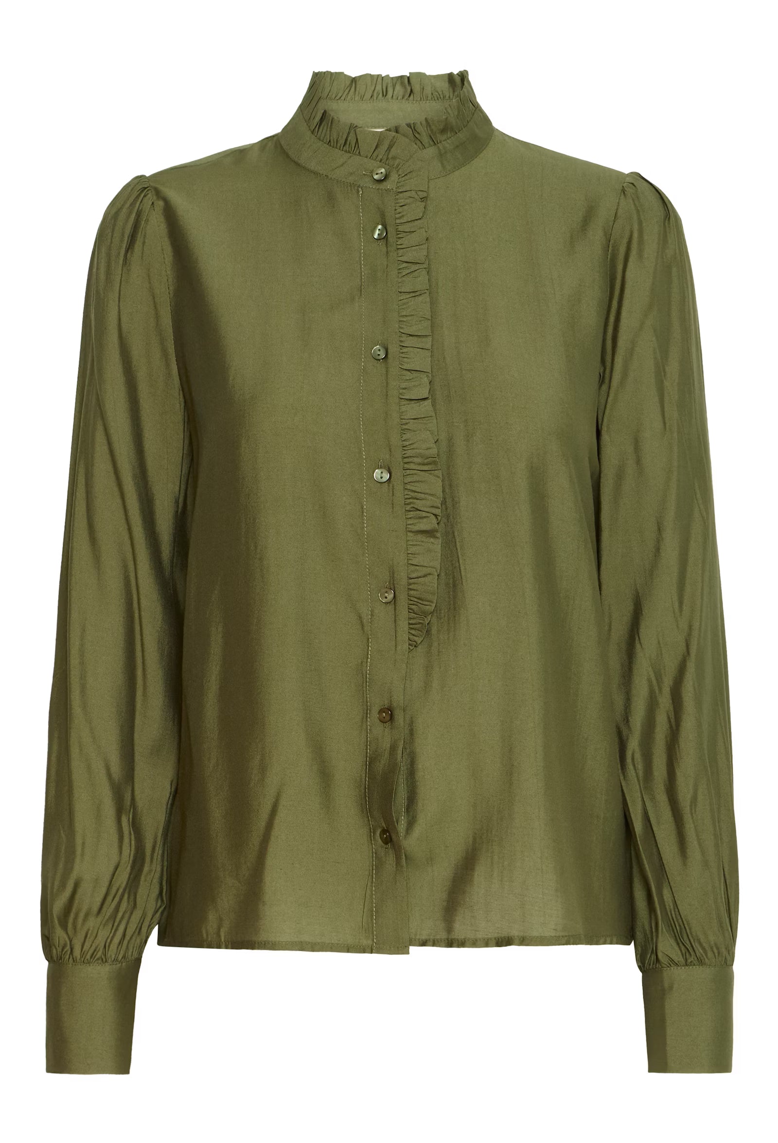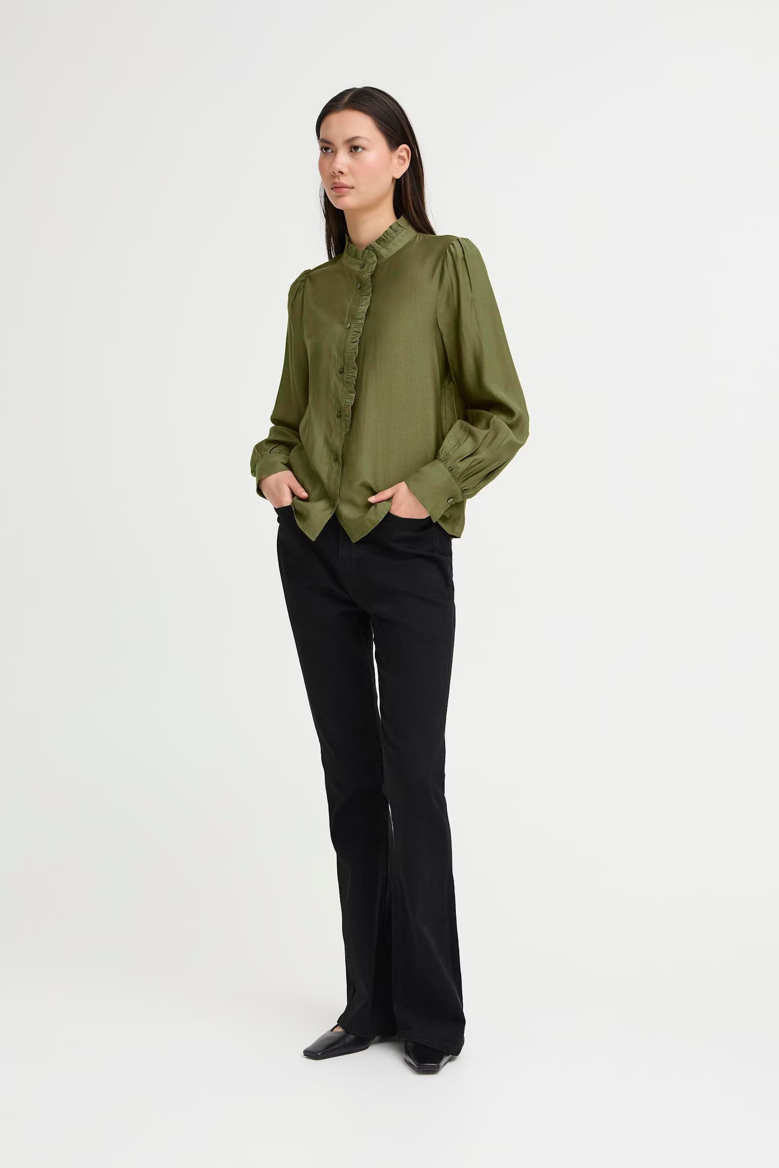 Questa blusa da donna presenta una vestibilità comoda, un raffinato scollo alto con delicato volant e maniche lunghe con polsini abbottonati. Il design con bottoni e il tessuto morbido offrono comfort per tutto il giorno.