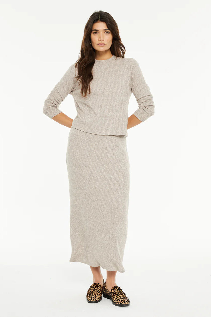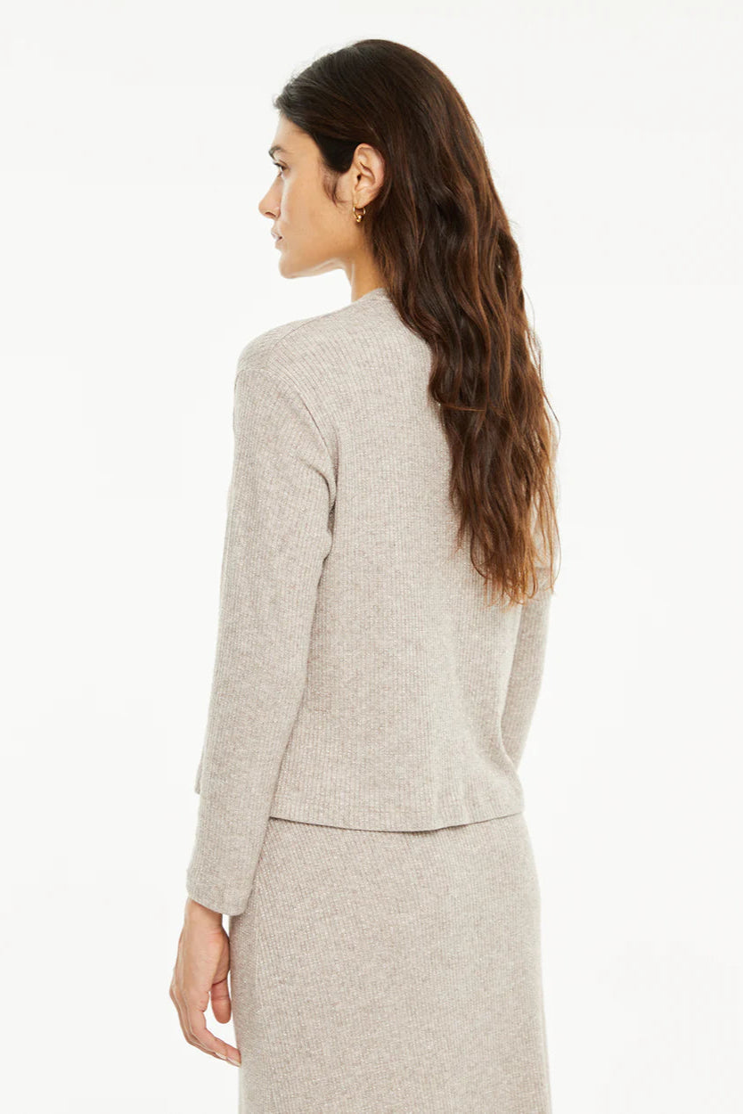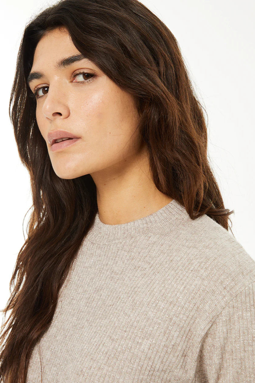 Maglioncino con tessuto canalizzato con lúrex, scollo Perkins e maniche lunghe.