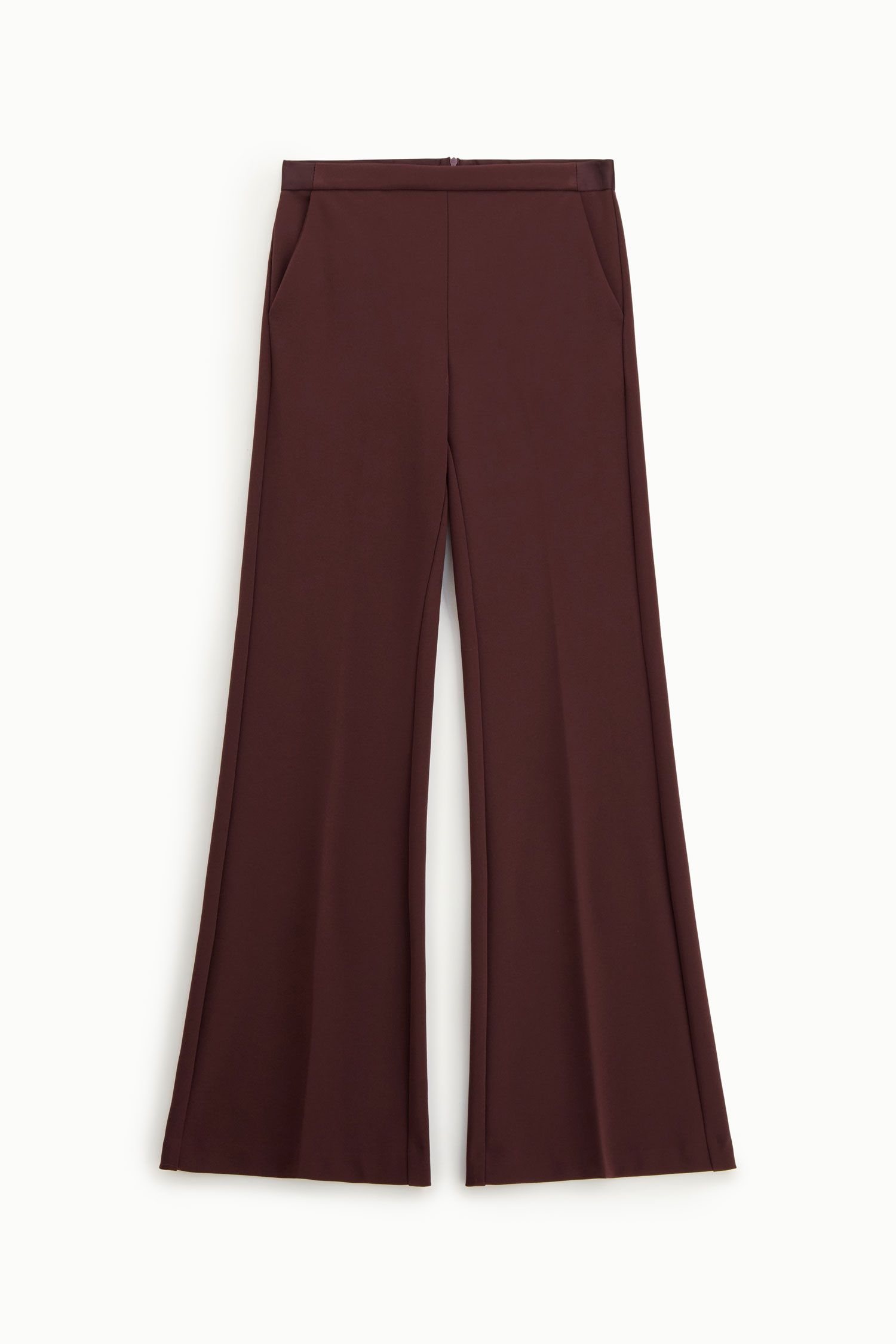 Tailleur prugna con blazer doppiopetto e pantaloni svasati